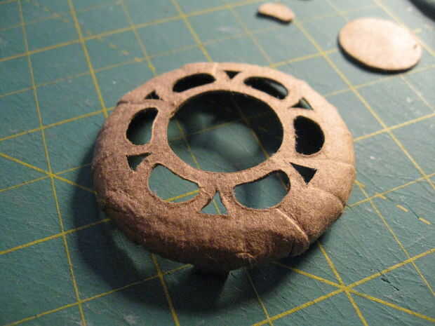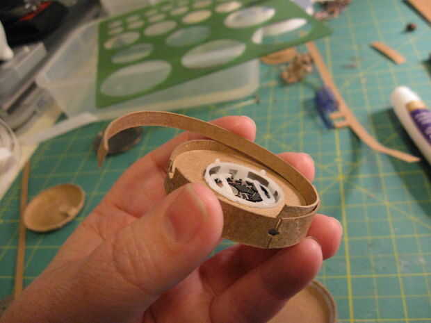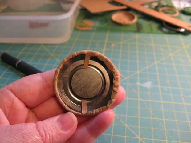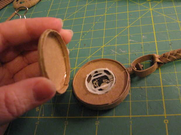 3. Coloque la cubierta frontal de metal en la cubierta de conglomerado y la decoración del rastro. Si su reloj de bolsillo elegido no tiene decoración, omita este paso.