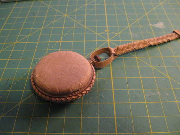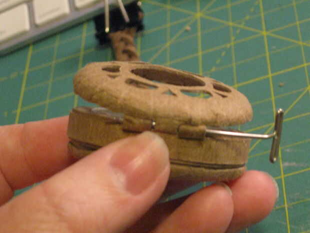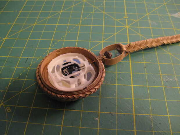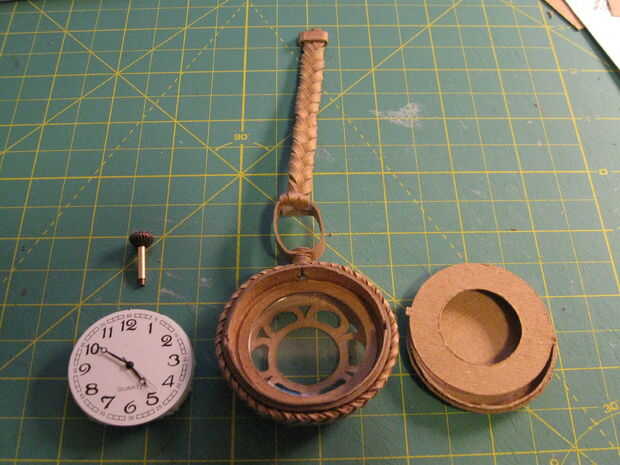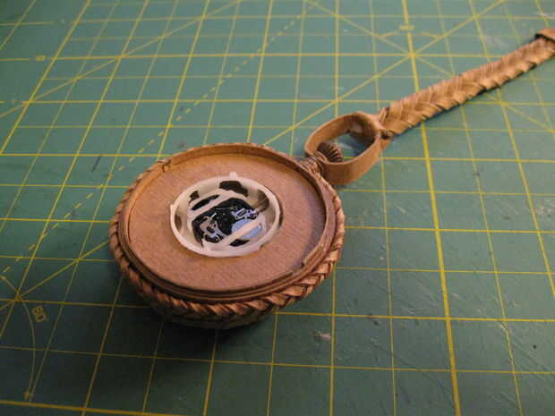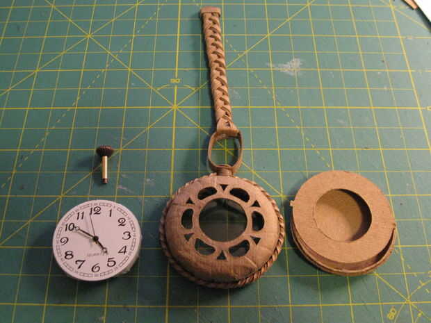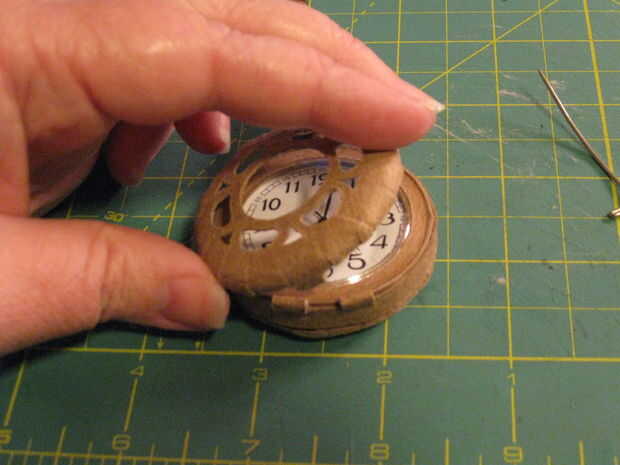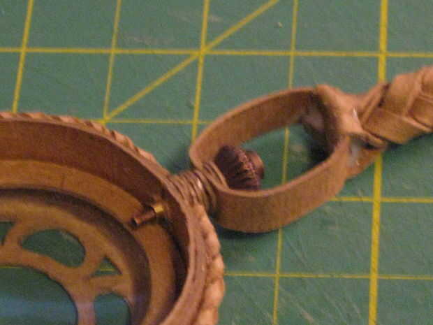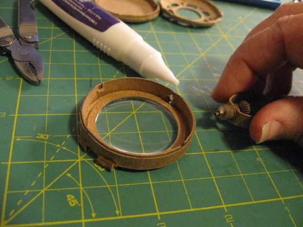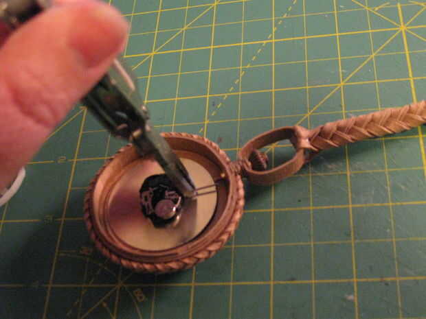 1. usando el poste metálico para ayudar con el alineamiento, pegue la cadena a la cubierta. Sujeción de estas piezas es un poco problemático, por lo que es una mejor idea para celebrar un poco. Prueba de ajuste que el mecanismo del reloj se alinea correctamente.