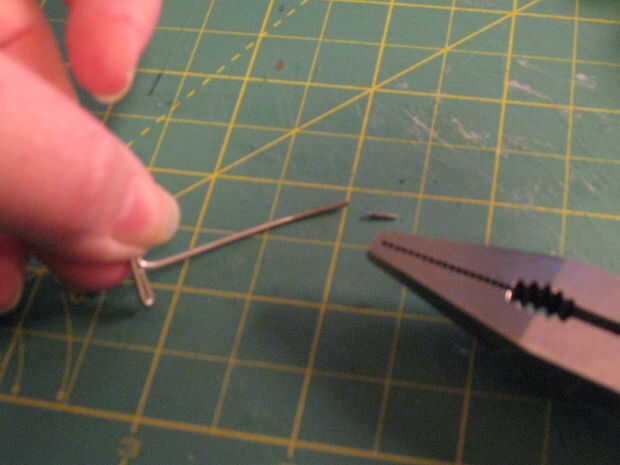 3. con un alicate, cortar el extremo puntiagudo de la clavija T. Mantenga la clavija T en la bisagra para medir la longitud del perno es necesitada. Cortar a medida.