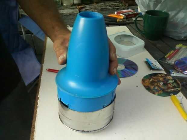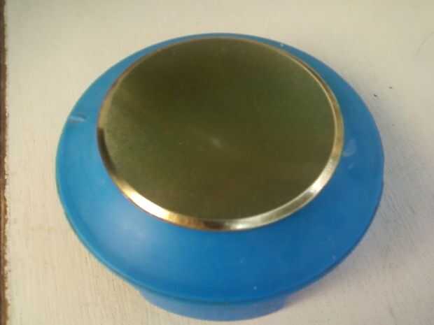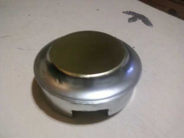 Para cubrir el gran agujero que había en el centro, me corte el fondo de la lata del caramelo y lo formó para caber sobre el reborde del anillo con el mazo de goma. Una vez que todo estaba montado y va a trabajar bien, lijar el plástico con un papel de grano grueso arena y rocía unas cuantas capas de pintura de plata sobre él. La etiqueta de la parte inferior de la lata de caramelos fue plástico adhesivo, por lo que optamos por simplemente despréndalo y mantener el color del oro del metal para romper toda la plata.