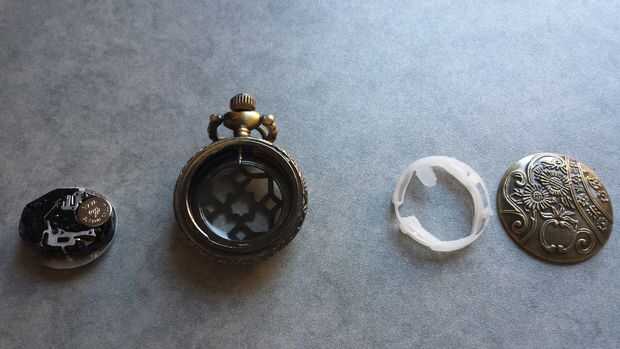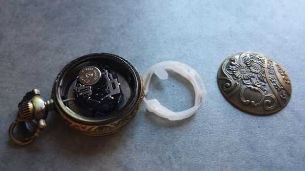 Utilice una uña para levantar con cuidado la parte blanca que sujeta las entrañas del reloj (no estoy seguro si esto es en cada reloj de bolsillo aunque). Luego doble las tripas de ver hacia arriba y fuera el reloj hasta que encajen hacia fuera. Ser suave! Usted puede reutilizar las piezas para otros proyectos y piezas dañadas generalmente no son una gran cosa.