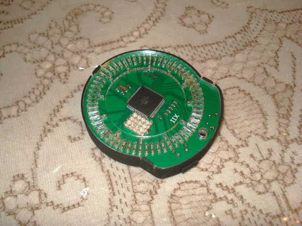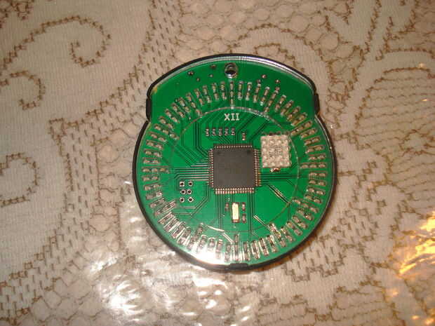 La batería es una batería de litio recargable ion botón y está cargada de un micro conector USB. Duración de la batería depende de cómo es utilizado el reloj de bolsillo, pero si usted lo deja solo, se estima que dure varios meses. Existe una función de indicación de batería baja. Este bolsillo ver también característica de un zumbador y un motor de vibración, que se utilizan para la función de alarma, y el motor hace un corto "tick" cada segundo pasa. El reloj de bolsillo está construido de un PCB, dos piezas del laser de cortan de plástico acrílico transparente, y un 3D impresa cubierta.