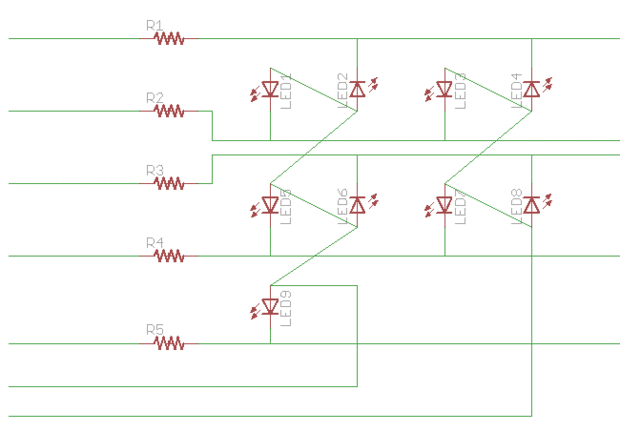 También necesito 5 resistencias (R1, R2, R3, R4, R5) para limitar la corriente a los LEDs, para operar dentro de sus calificaciones y no queme. Es importante notar diverso color LEDs tienen caídas de tensión distintas y diversas especificaciones actuales seguras máximo, y también el voltaje de la batería variará con el tiempo (superior a su tensión nominal durante e inmediatamente después de la recarga). He seleccionado una resistencia de 330 ohm comunes para este trabajo. Tomando el peor caso, que es 0 de tensión en el LED y una batería de 4.2V, Ley de Ohm dice que la corriente será 12.7mA. Esto es seguro para casi todos los LEDs pequeños y seguro para lo GPIO del microcontrolador.