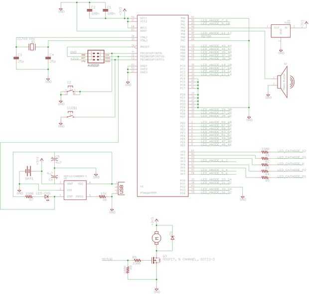Al final, hubo espacio y pins gratis sobrados así que añadido un zumbador y un motor de vibración. El motor es impulsado por un MOSFET. El MOSFET tiene un resistor de pull-down (R8) en la puerta para no volver loco cuando el microcontrolador no es controlarlo. Hay una resistencia (R9) a puerta de MOSFET para proteger el pin del microcontrolador de un breve repunte actual durante la conmutación. El diodo está allí para proteger el circuito de la back EMF desde el motor (este diodo se conoce como un diodo flyback).