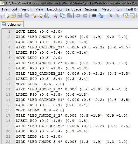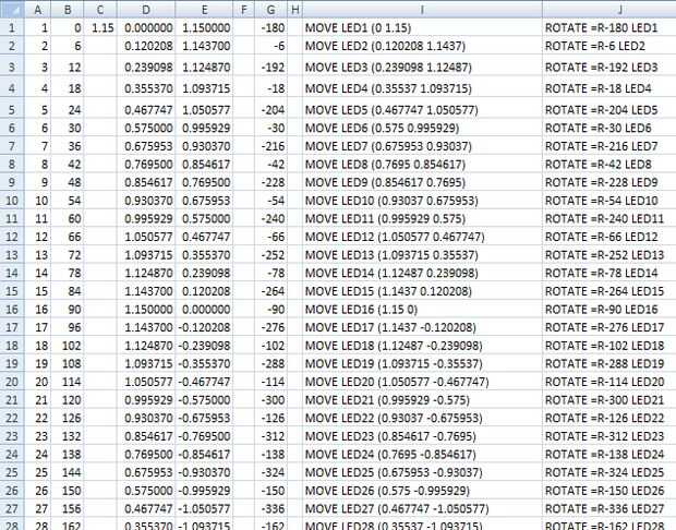 Se podría pensar perfectamente organizar 132 LEDs es un dolor en el culo, no lo es, si sabes cómo hacerlo. Utiliza una hoja de cálculo para calcular las coordenadas y el ángulo de cada LED y luego usa la hoja de cálculo para generar una secuencia de comandos EAGLE (era solamente un puñado de mover y rotar los comandos, consulte la ayuda del águila archivo, también tengo una captura de pantalla anterior). Corrí el script en águila y así fue el arreglo al instante.