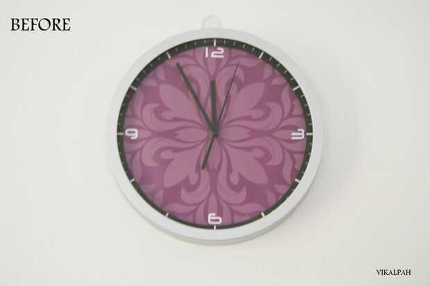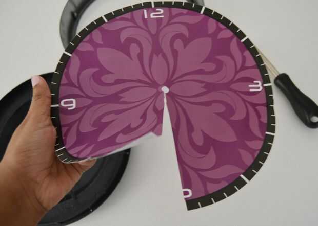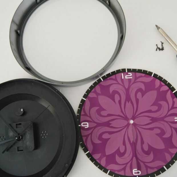Quite los tornillos de la estructura trasera del reloj con destornillador y desmontar el reloj. Retire con cuidado la hoja de diseño. Cada reloj será diferente. Mina fue pegado al marco pero era fácil de despegar. Si tuyo donde como el mío, cuchilla xacto y rasgón del centro a un extremo. Ahora conseguir un agarre de papel. Ajustar todas las agujas del tres reloj para estar juntos (12' reloj de o o 3.15 o 6.30 o lo que sea, tienes, correcto?) y retire el papel. Al llegar cerca de las agujas del reloj moverlos y pelan esa zona.