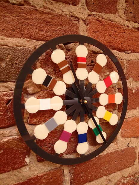 Un reloj de pared parecía perfecto para aprender los colores - es algo que puede parecer en un número de veces por día, aproximadamente tiene el número correcto de dígitos/colores y de todos modos es generalmente útil. Por lo que yo diseño y después a través de un par otros diseños, colocó sobre el uso de piezas de acrílico - color beige para los núcleos de resistencia, gris para el interiores y exteriores "cables" - pegados con cinta aislante que envuelve. Es ciertamente posible hacerlo en una gran pieza de acrílico y pintura de los corazones, pero esto parecía más un desafío y un poco más divertido. El reloj es 10" de diámetro, un buen tamaño mediano reloj.