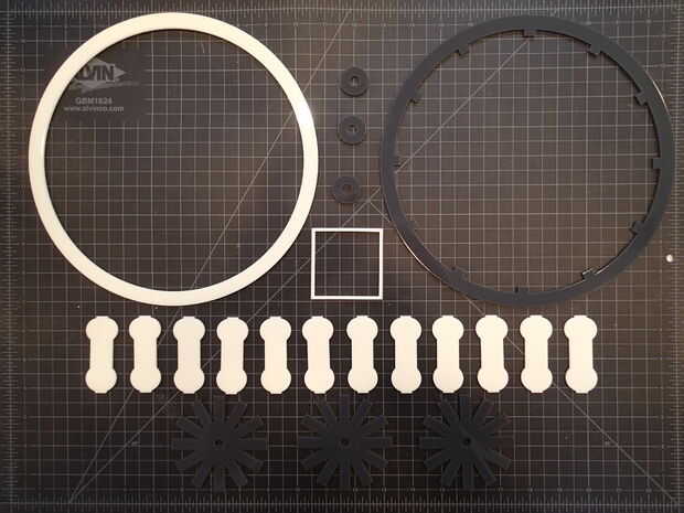 El archivo de "Cables" contiene el borde exterior, tres ejes con brazos de distinta longitud (para asegurarse de que las interfaces con los corazones queden al ras) y unos pequeños aros que puede utilizar la interfaz de cara-el movimiento del reloj si desea.