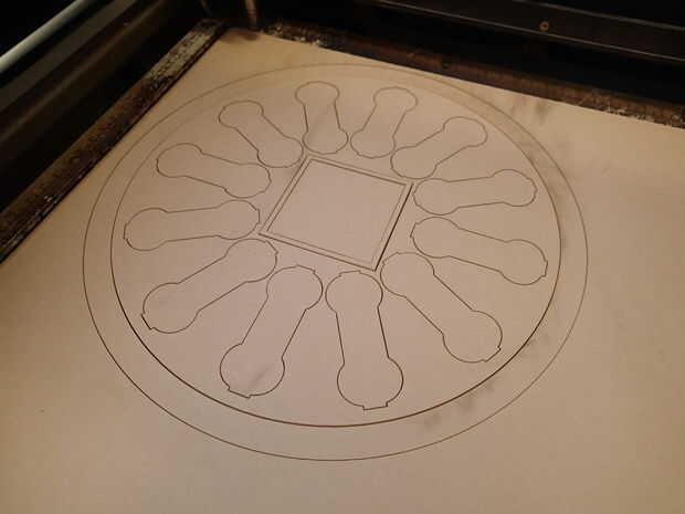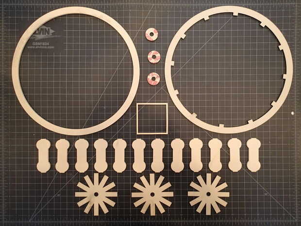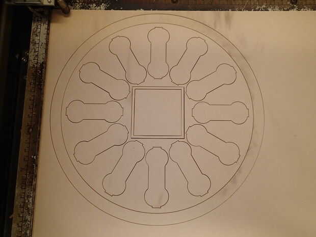 El archivo "ResistorCenters" contiene los núcleos de 12 "resistencia", el contorno cuadrado que pensé que usaría como un marco alrededor del reloj movimiento pero terminó rompiendo para utilizar como las costillas refuerza y un anillo externo que se podía utilizar en el reloj pero fue usado más para escalar el archivo en CorelDraw que cualquier otra cosa.