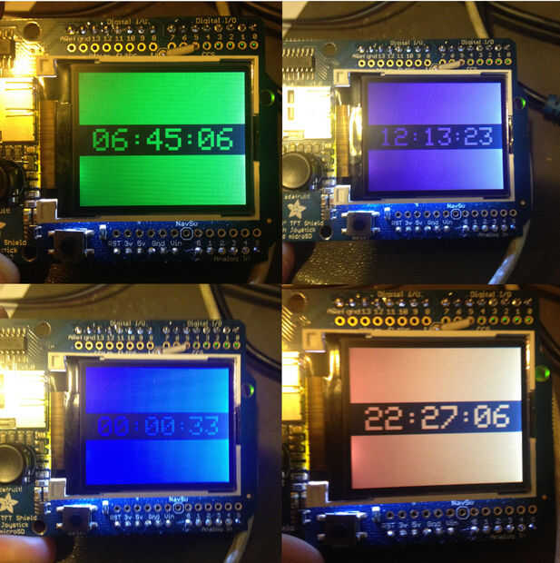 Tuve un Arduino Uno R3 y un Adafruit 1.8" TFT pantalla de Color w/microSD y palanca de mando que estaba tratando de usar para otro proyecto que mantuvo estancando hacia fuera. Una noche solo por diversión he decidido ver si podía volver a crear el reloj de color y sólo tomó un par de horas. Si estás familiarizado con Arduino se podría fácilmente cambiar las piezas hacia fuera por un simple TFT breakout y algo pequeño como un escarabajo y una unidad muy compacta. Incluso podría usar como una tarjeta de identificación.