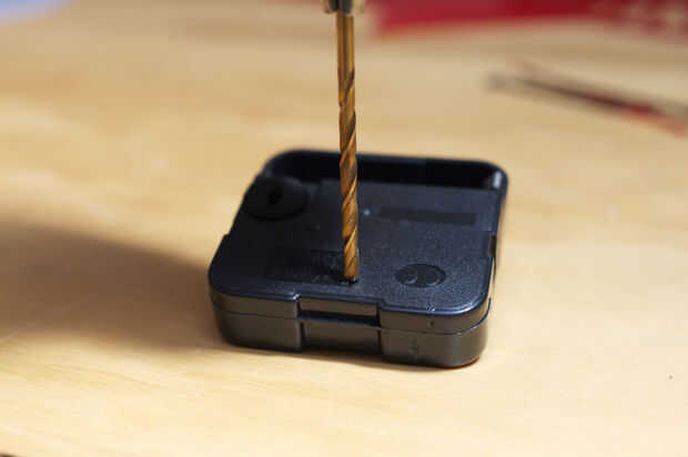 Si está usando un movimiento de reloj de Ikea, un 1/8" agujero directamente a través de la"Q"en"Cuarzo"en la parte posterior el movimiento de taladro. Esto creará un orificio de montaje que no interferirá con los engranajes.