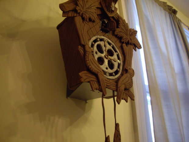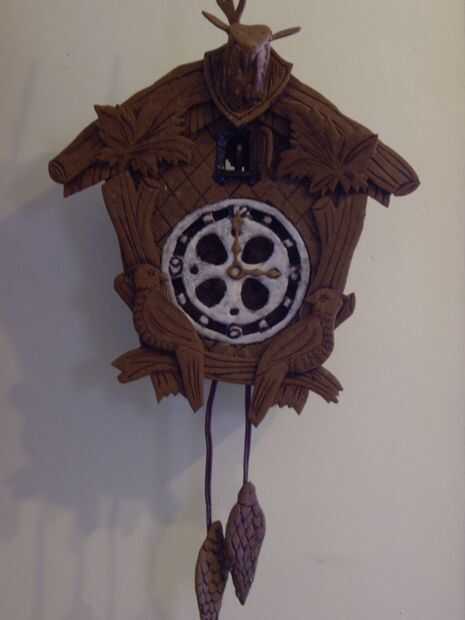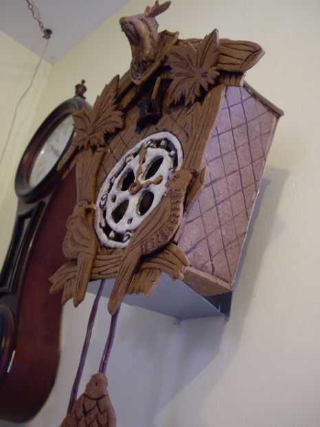 Usé colorante marrón glacé, mezclado con un poco de agua para crear sombras en todos mis detalles "xilografía". También usé glaseado blanco en la cara del reloj. Utilicé algunos negro decoración de gel para el detalle alrededor ocultar-i-agujero del cuco, y el cuco birdy tiene también algunos rojo decoración de gel de él.