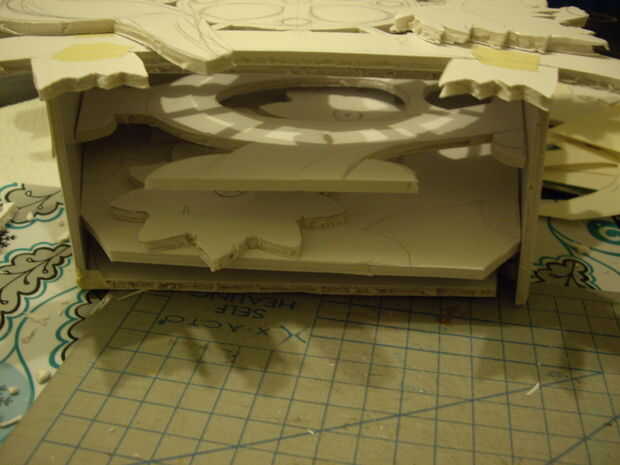 Después de que yo había averiguado lo que quería dibujaba a base de la espuma, cortar todo y grabado juntos para crear lo que se ve en las fotos. Los engranajes de la base de la espuma que había creado funcionó bien, pero aplasta un poco como base de la espuma tiende a hacer, cuando he intentado convertirlos. Pude sólo espero que engranajes Gingerbread serían más difíciles y resultaría bien.
