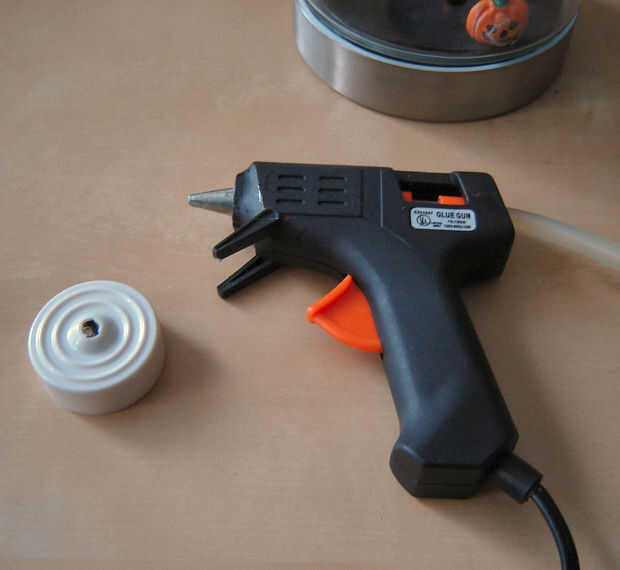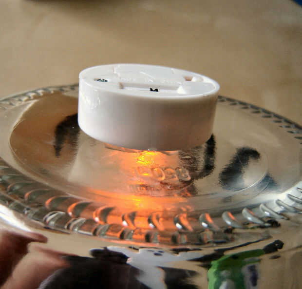 Este paso es opcional.  Pensé que el reloj sería espantoso si tuviera una luz parpadeante usé un LED tealight. Retire la llama y péguelo a la tapa de la jarra con la luz hacia abajo en el diorama.