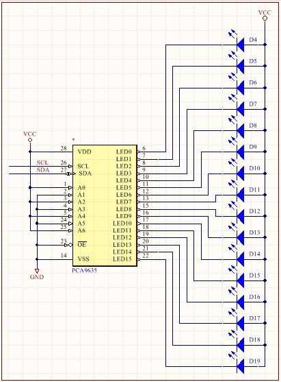 Necesitamos un controlador de LED de 16 canales con pines de control como pocos como sea posible. Fui por mis cajones y encontró un controlador de controlador de LED PCA9635 (salvado), que puede ser controlado a través del I²C bus. Perfecto! Mi procesador tiene dos módulos de I²C, incluso puedo escoger que uno se uso - depende de la PCB que veremos más adelante. Dicho esto, soltar el PCA9635 en el esquema.