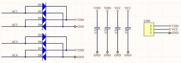 Este esquema contiene dos puentes rectificador, un regulador LDO junto con su entrada y salida filtro casquillos y las bobinas caseras que vamos a utilizar como una especie de PICK-UPS. Un LED se pone en este foro así como a la señal si la cosa funciona o no.