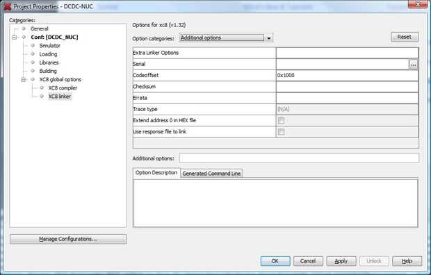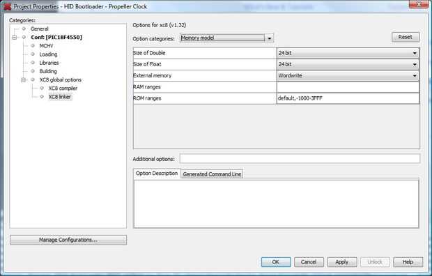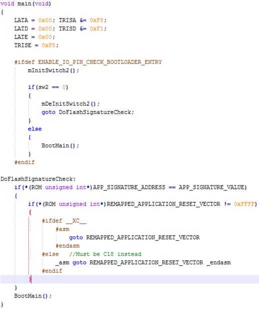 Desde el PIC comienza a ejecutar desde la dirección 0, lo más simple y más común es colocar el código de gestor de arranque allí y el código de usuario justo después el gestor de arranque. El código de gestor de arranque puede modificarse para comprobar si existe o no un firmware válido por escrito en la foto. Esto se hace comprobando el contenido de la memoria en dirección 1006-1007 horas. Después de cada programación, los insertos de bootloader "600D" (leet de 'bueno') en este lugar, lo que significa que el código se ha escrito en el PIC con éxito - esto es lo que consigue comprobar su validez. Debemos especificar en la configuración de proyecto de aplicación de usuario que esta ubicación no debe ser sobrescrito, ver las imágenes para ver cómo se hace (ROM gamas se especifican para saltar este lugar cuando se compila el código de la aplicación de usuario). No hacerlo resultará en errores muy difíciles de detectar más tarde. La sección donde las mentiras del gestor de arranque deben estar protegidas así: esto se hace por compensación el código de la aplicación de usuario todo por 1000h (código offset parámetro en las opciones del vinculador). Gestores de arranque son generalmente situados al principio o al final de la memoria de programa - debe tener cuidado de no sobreescribirlo!