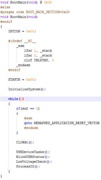 Para poder utilizarlos dos, tenemos que cambiar de alguna forma entre estos dos programas. Este cambio puede hacerse en base a una condición, evento o lo que sea - va a ser muy parecido a una declaración enorme "if". Elegí esta condición que el nivel de voltaje en un pin de entrada, RD3 IO del registro PORTD. Este pin es conectado al pin de 5V del conector USB a través de un resistor. Si el pasador está en 5V en el arranque, el PIC tiene que ejecutar la rama del gestor de arranque de la gran "si", si es 0V, el código de la aplicación de usuario tenía que ejecutar. Coloqué el código de usuario justo después del código de gestor de arranque, en la dirección 1000h. El PIC18F4550 verifica el pin RD3 repetidas veces, así que cuando se quita el cable USB y 5V desaparece del RD3, el PIC va saltar el código colocado en el 1000h, código de la aplicación de usuario. En el código de la aplicación de usuario verificar nuevamente el nivel de voltaje en el RD3, si el programa ve a 5V en él, el cable USB está conectado otra vez y el PIC tiene que saltar para el gestor de arranque. Hacer este salto al modo gestor de arranque con una instrucción de "RESET" de montaje en línea.