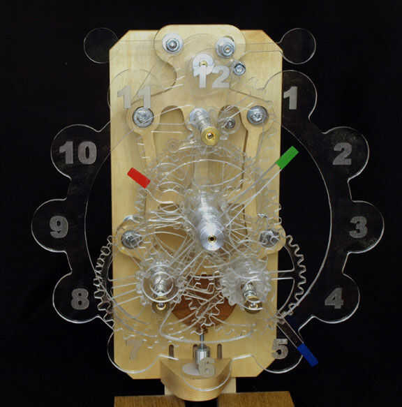Esto el resultado cuando completamente montado. Todo lo del tren de engranajes es visible por el acrílico claro. Aplicar algún color a las puntas de las manos por lo que su posición se puede hacer más fácilmente.