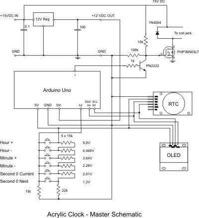 Un regulador de 12V simple pasos abajo de la tensión de entrada 12 VCC que es la fuente para el Arduino Uno. La forma de 5VDC que los poderes de Arduino el RTC reloj y el OLED Mostrar y es también la tensión de la fuente para la escala de resistencia pulsador.