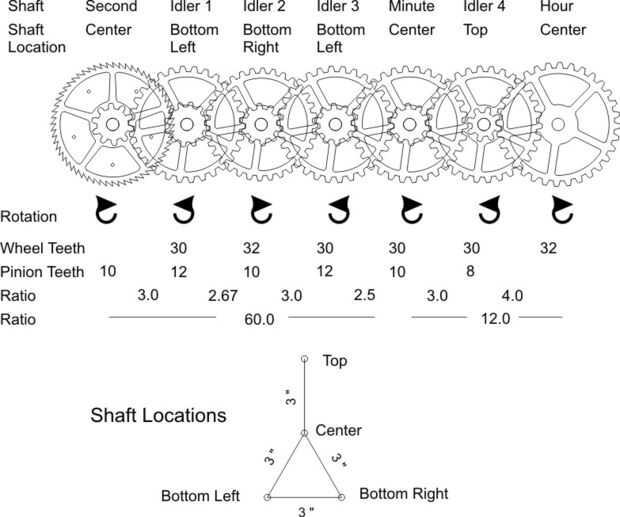Necesitamos una reducción del engranaje de 60: 1 desde el segundo al minuto eje y 12: 1 desde el minuto en el eje de la hora. Tiene que haber un número par de conjuntos de rueda de piñón para mantener la rotación en sentido horario.