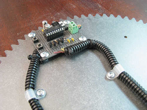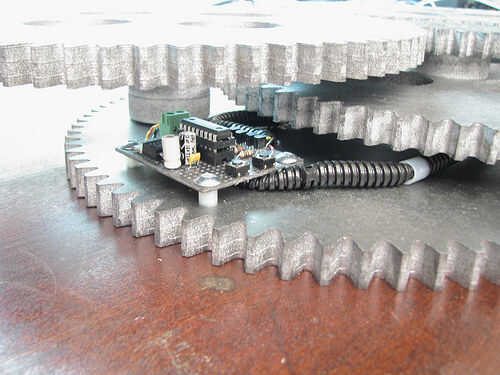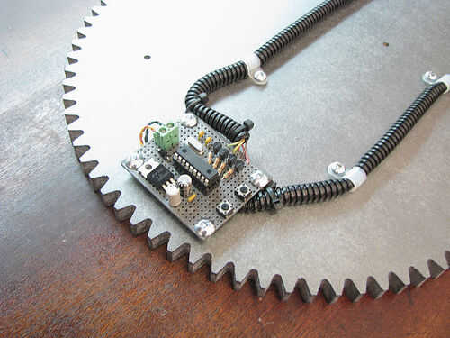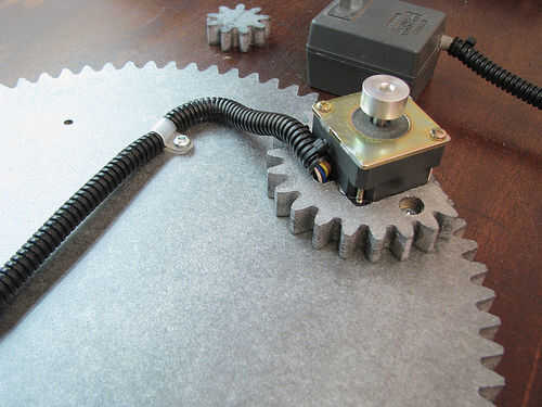 El motor es un motor de pasos unipolar que ha sido aprovechado de una vieja disquetera de 5 1/4 de pulgada. Este es el motor que mueve la lectura escribir cabezas y hacia atrás, para conseguir una de este tamaño y potencia que usted necesitará encontrar un viejo agradable. Modernas unidades de disco flexible no tienen motores PAP con este nivel de esfuerzo de torsión.
