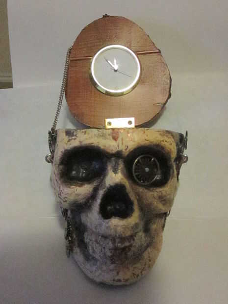 Entonces comencé a trabajar en el casquillo del cráneo primero trazado en la parte posterior de la madera laminado y corte hacia fuera. Luego midió el diámetro del agujero y cortar la lámina por la mitad y luego cortar el agujero para que el reloj en. Corte y trabajé en el fieltro negro y luego caliente las dos piezas de laminado había pegado en su lugar. Me aseguré de tener cerca de un cuarto de pulgada entre las dos piezas de laminado para añadir un poco de la tubería de cobre que tenía restos de. Luego he añadido la bisagra en el interior del cráneo detrás de base y el borde posterior inferior de la tapa del cráneo con tornillos y pegamento caliente. Adjunto 2 tornillos de ojal uno en la tapa y otro en la base del cráneo a lo largo del lado derecho y me adjunta un pequeño eslabón de la cadena entre los dos. Esto me permitió tener el cráneo abierto sin la parte superior acaba cayendo todo el camino detrás. También he añadido una pieza pequeña del cerebro en forma de fieltro negro para la parte inferior del interior de la base del cráneo.