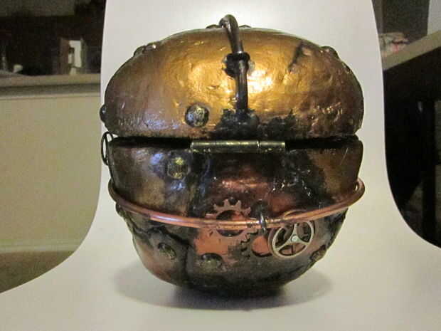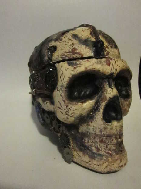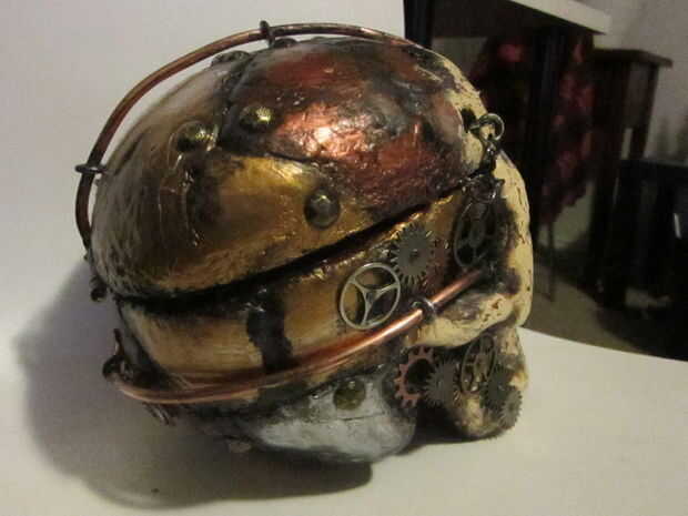 Comencé tomando las uñas y les pega caliente a través de las piezas de la corona y luego caliente pegado y perforado el cráneo en varios puntos para crear una sensación de punk de vapor muy. Atornillan 3 tornillos de ojal en la parte superior y 3 a lo largo de los lados espaciadas como se ve en las fotos y colocar un doblado a pieza de forma de la tubería de cobre a través de los ojales y caliente pegado en cada extremo. He añadido las tachuelas de latón muebles a lo largo de los paneles para parecerse a los pernos.