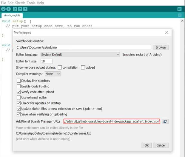 Entonces debe instalar el software adecuado para soportar microcontroladores Adafruit (suponiendo que usas el Abalorio Pro). Abrir preferencias y pegar el siguiente enlace en el cuadro para adicional tableros Manager URL: