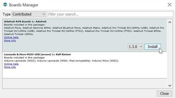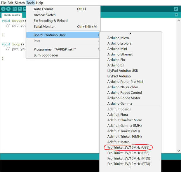 Vaya a herramientas > Junta Directiva > tablero Manager e instalar "Adafruit AVR juntas" bajo contribuí. Ahora al abrir herramientas > tablero, verá una lista completa de nuevos tableros de Adafruit. Seleccione la opción de "baratija Pro 5V / 16MHz (USB)" y establecer herramientas > Programador "USBtinyISP".