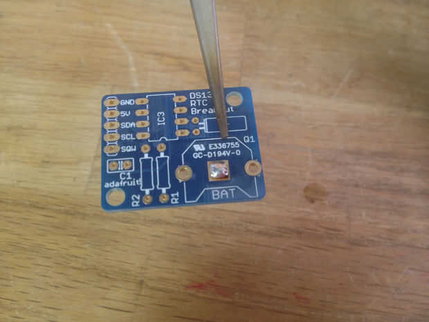 El desglose de reloj en tiempo Real requiere una instalación adicional. Empezar por la fusión de un trozo pequeño de soldadura en la almohadilla de soporte de batería (esto le dará la célula de la moneda un ajuste agradable y cómodo). Luego, soldar cada componente en sus respectivas posiciones marcadas por la pantalla de seda.