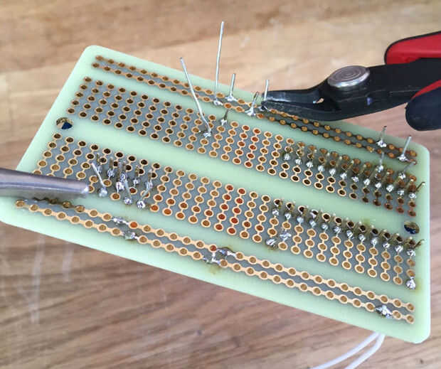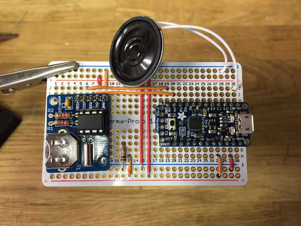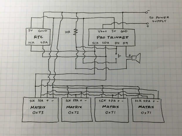 En primer lugar, la soldadura la baratija Pro y RTC en el proto-board. Luego soldar cable de conexión para conectar todos los pines GND y 5V. También conectar las líneas I2C (SCK y SDA). A continuación, agregue el altavoz al pin digital 9 y el resistor de pull-down para pin digital 4.