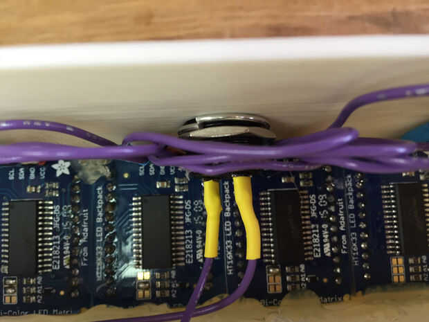 La pistola de pegamento caliente matrices de pegamento el LED en el cuerpo del reloj (sería un ajuste apretado) y la soldadura los cuatro cables a los 5V, pines GND, SCK y SDA de la baratija Pro.