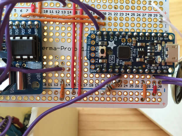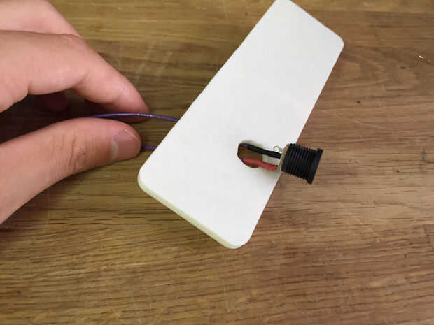 Ajuste al conector de DC a través del orificio en el reloj hacia atrás y asegúrelo con la tuerca incluida. Luego suelde los cables a los pines Vbat y GND de la baratija Pro.