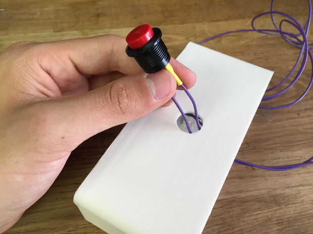 Instalar el botón y asegúrelo con la tuerca incluida. Soldar un cable a la energía positiva y el otro al pin digital 4 de la baratija Pro.