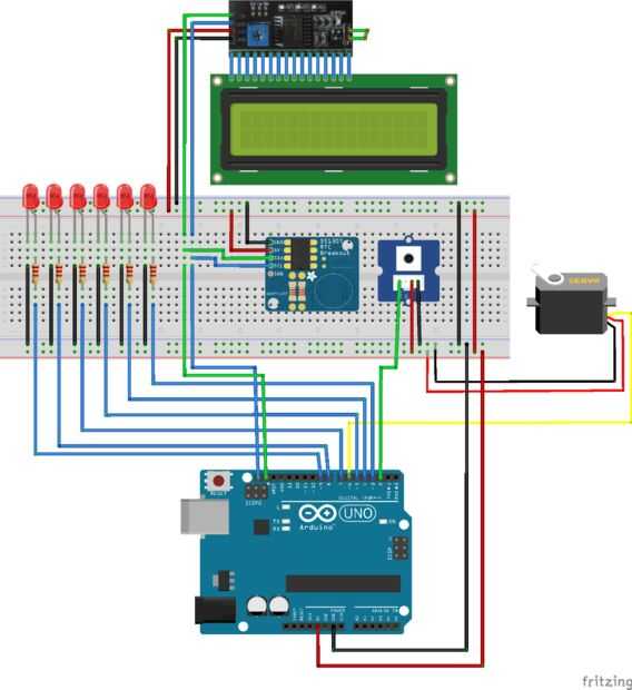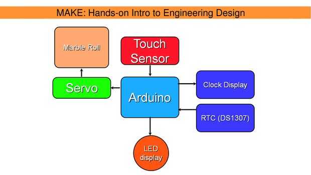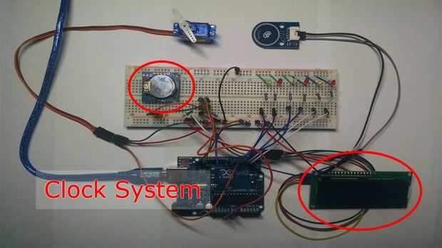 Arduino utiliza un Real Time Clock (RTC) para actualizar la fecha y hora. Esta información aparece en la pantalla LCD. Arduino también utiliza la entrada de un sensor táctil para activar el movimiento del servo, así como la exhibición de LED.