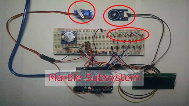 El subsistema de mármol está diseñado para producir una reacción física a la entrada del usuario. Los registros del sensor táctil de entrada y envía una señal al arduino. Cuando arduino recibe esta entrada, activa la rutina de movimiento servo y la activación de LED. El servo está programado para moverse hacia adelante y hacia atrás tres veces en toda una gama de 42 grados. Cada 14 grados, el siguiente LED se enciende y se apaga la última de ellas. Al finalizar la rutina, el LED se apague y el sistema espera a que el próximo usuario.