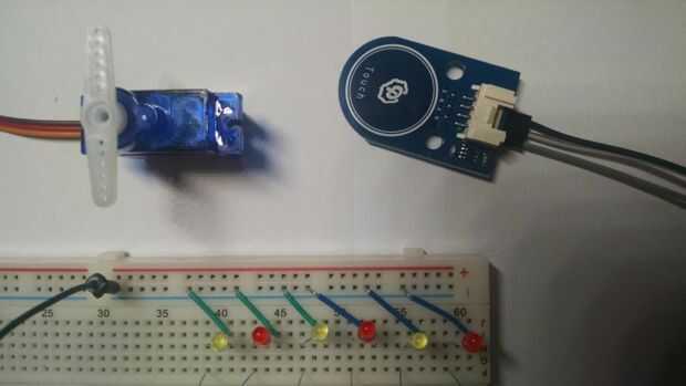 El sistema de mármol está compuesto por tres componentes principales: el sensor de contacto, el servo y los seis LEDs.