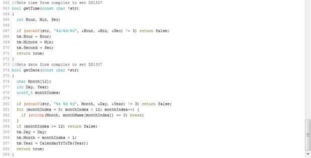 Líneas 362-389 contienen el código para las funciones usadas para establecer la hora en el RTC. GetTime guarda los datos de tiempo, mientras que GetDate guarda la información de fecha.
