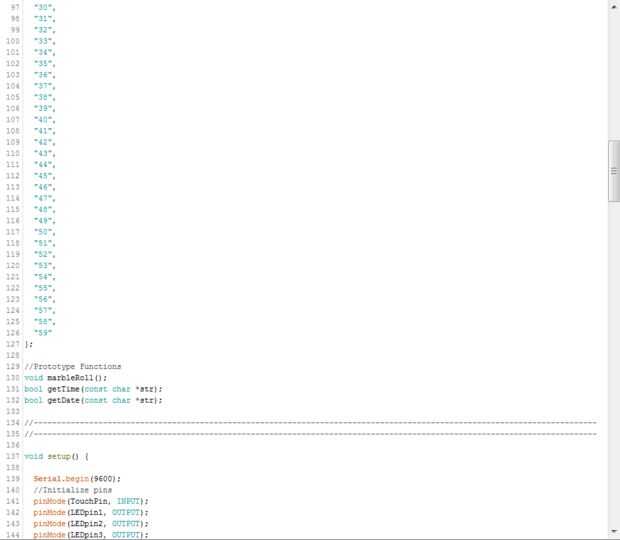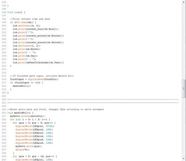A continuación, líneas 216-219 gatillo la rutina para el movimiento del servo y pantalla LED. Línea 216 comprueba el estado del sensor táctil. El sensor produce una entrada de baja cuando detecta tacto y produce una alta entrada en todos otros tiempos. Si el pin 2 recibe una entrada baja, llama a la función "marbleRoll".