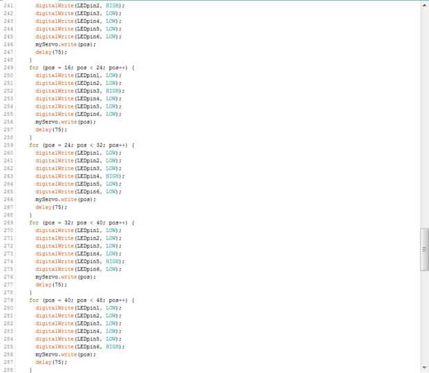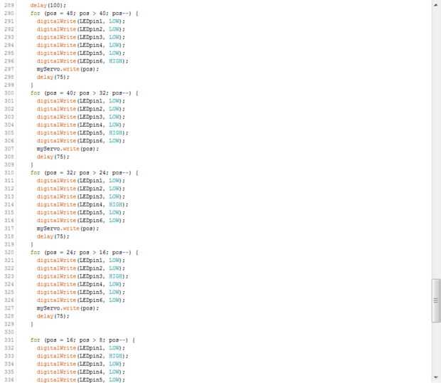 Líneas 226-360 contienen el código para la función MarbleRoll, que se mueve el servo y actualiza los LEDs. Línea 227 conecta el servo al pin 6, luego línea 228 repite la rutina 3 veces. El código de movimiento del servo se divide en 12 secciones. Cada una de estas secciones mover el servo a través de una gama de 7 grados y encender un LED diferentes. Las seis primeras secciones mover el servo de un lado a otro, y las siguientes secciones volver a donde empezó. Cada gama de 7 grados se enciende un LED diferentes, creando el efecto de los LEDs siguiendo el movimiento del servo. Después de la rutina se ejecuta 3 veces, la línea 352 separa el servo. Por último, líneas 354-359 apagará todos los LEDs.