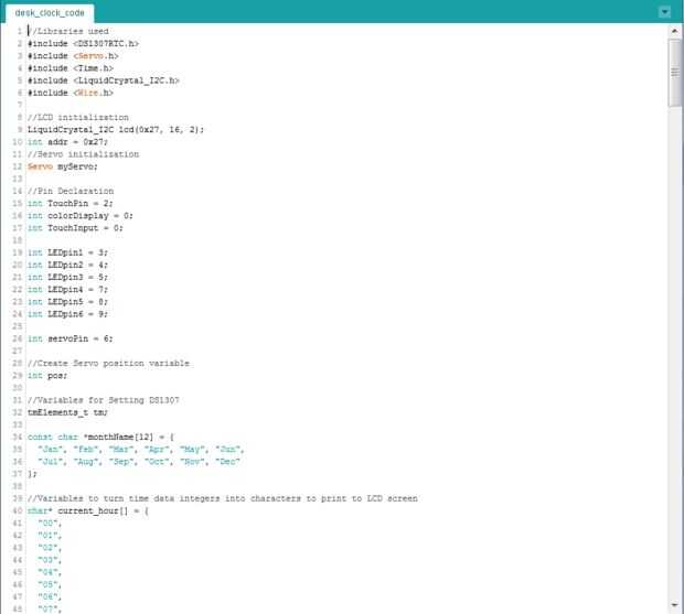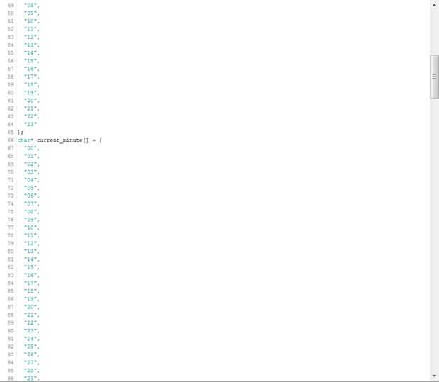 El resto de la sección (líneas 28-133) contiene variables para establecer el RTC y convertir a números enteros de tiempo en personajes que luego pueden ser impresos en la pantalla LCD.