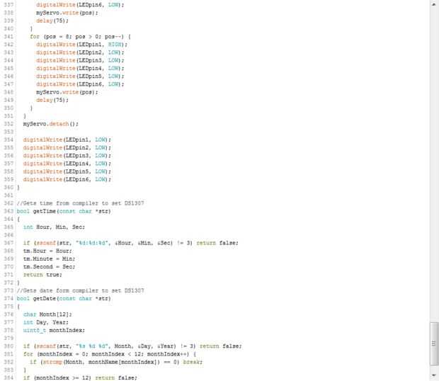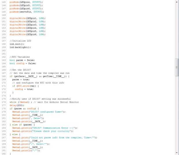 En primer lugar, las bibliotecas necesarias se incluyen para dar el programa de acceso a funciones que ya se han escrito. El DS1307 y tiempo las bibliotecas se utilizan para el RTC. La biblioteca del Servo se utiliza para funcionar el servo. Por último, las bibliotecas de LiquidCrystal_I2C y cables se utilizan para actualizar la pantalla LCD I2C.