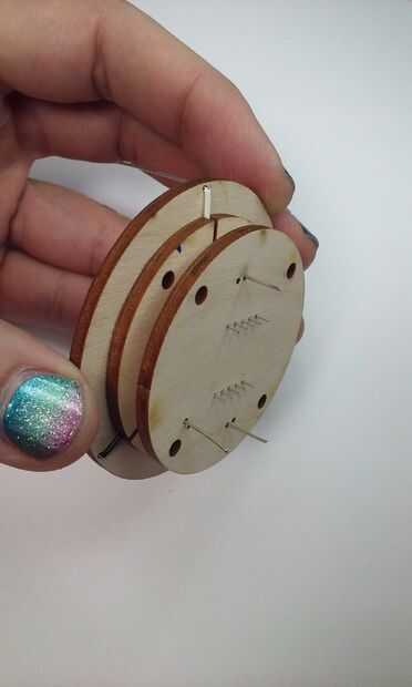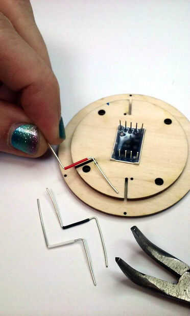 Una vez que las dos primeras capas están Unidas y el pegamento está seco, preparar tres trozos de cable aislado macizo caber a través de los orificios del borde de la cara frontal, correr hacia abajo de la ranura y doble hacia arriba al final de cada ranura como en la primera foto. Cada cable debe ser alrededor de 3 pulgadas (80mm) de longitud. En caso de duda, ya es mejor.