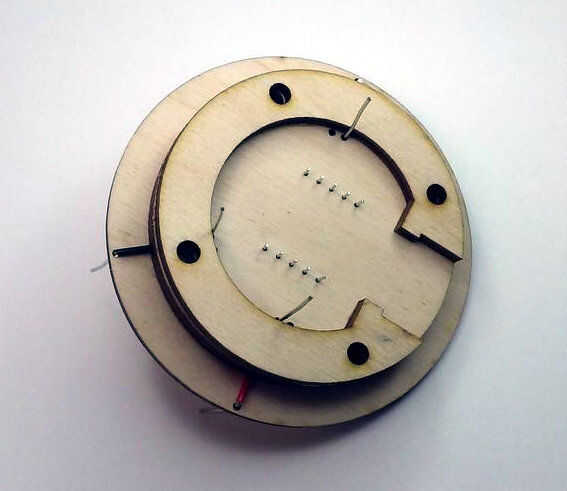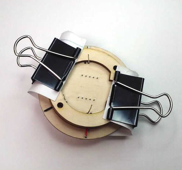 Aquí, usted puede sujetar en su lugar y deja secar, o ahorrar tiempo y añadir la siguiente capa y sujete ambos al mismo tiempo. La siguiente capa es la pieza en forma de C. Es simétrica, así que Aplique pegamento en uno de los lados y poner en su lugar, utilizando los 4 agujeros grandes como una guía. El lado abierto de la "C" es en el sentido del número "9" en la cara frontal del reloj. Apretar y dejar para secar.