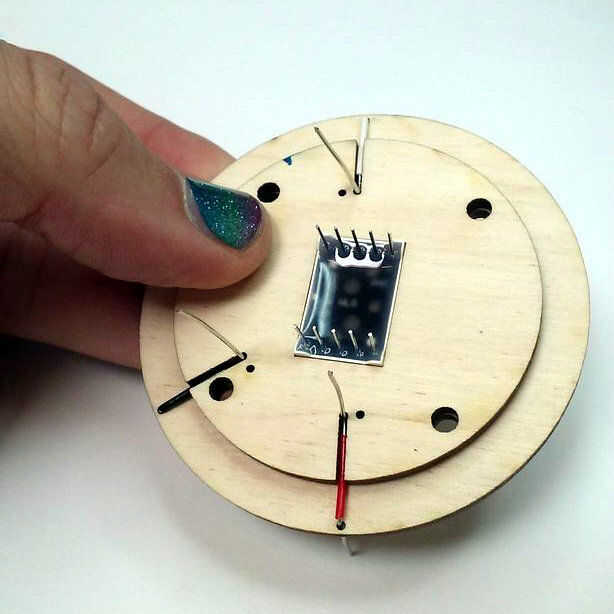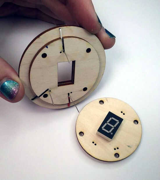 Con cuidado Aplique pegamento en el área restante de esta pieza, cuidado de no acercar demasiado a los agujeros, o el LED de 7 segmentos. Alinee la pieza para que los tres cables pasan por los orificios adecuados (véase el cuadro arriba) y pulse a la vez, usando otra vez el LED de 7 segmentos como guía.