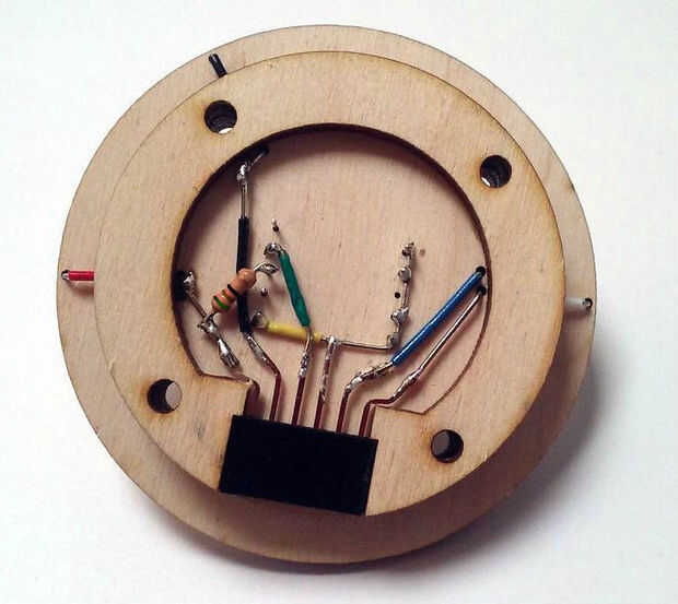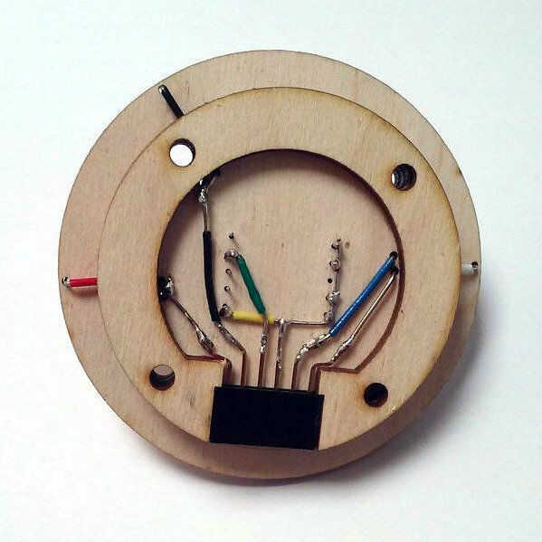 Añadir tres cables de 3"(80mm) a través de los orificios pequeños restantes. Estas son el suelo, potencia y señales de datos para los más pequeños, 12 anillo de NeoPixel. Afortunadamente, están alineados con el otro anillo, así se pueden unir los cables de tierra para los dos anillos, también pueden unir los cables de alimentación.