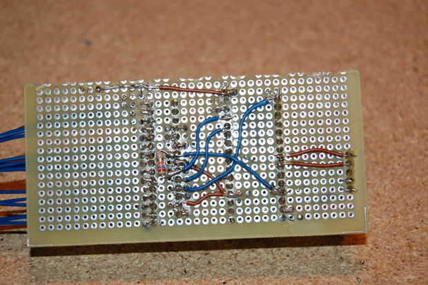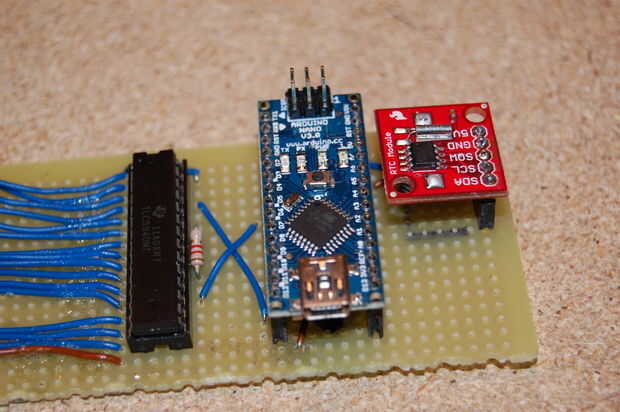 Construir el circuito en protoboard o en forma de PCB, como se muestra en las imágenes, o abrir el archivo adjunto de Fritzing . Tenga en cuenta que la electrónica debe caber dentro del reloj, así que mantenga todo apretado. Cuando conecte los cables de LED (no conectar los LEDs aún) a la PCB o protoboard, tenga en cuenta que los LEDs estarán a diferentes distancias.
