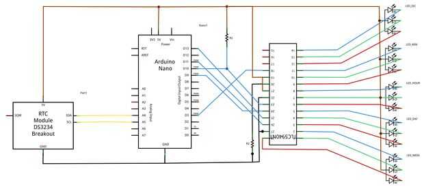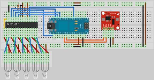 El Arduino es el principal componente del reloj. Controlará el LED mediante el ajuste de la intensidad de luz para cada uno de los tres componentes (rojo, verde, azul) para conseguir un determinado color. Por ejemplo, los valores RGB (50%, 50%, 0) permitirá que nuestro cerebro piense , vemos amarillo. Para ello utilizamos la técnica PWM , pero desafortunadamente la mayoría Arduinos sólo tiene 6 salidas PWM. Por suerte, acaba de comprar un TLC5940, proporcionando 16 salidas PWM mientras que necesitamos 5 x 3 = 15. El TLC5940 requiere dos resistencias; R1 es un resistor de pull-up y tiene que ser alta (10kOhm o más), R2 establece la cantidad máxima de corriente de los LEDs (típicamente alrededor de 2kOhm; prueba con un LED y la fuente de energía antes de empezar a soldar).