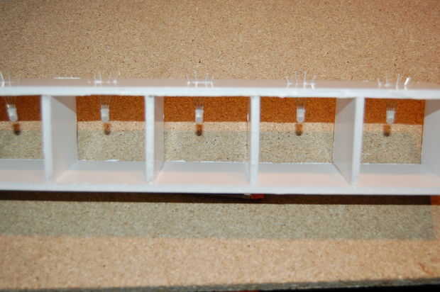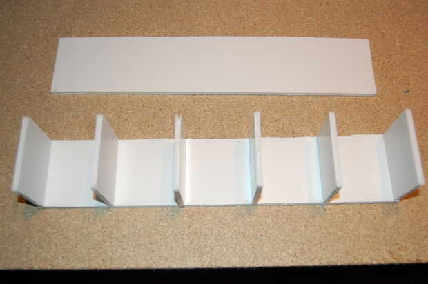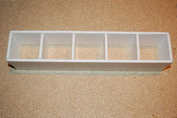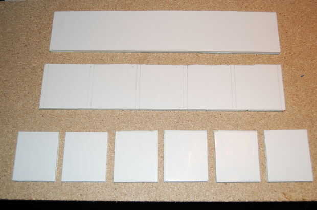 Primero cortar la parte inferior y superior de la fila del cubo (para mí que el tamaño tuvo que ser 6.5cm por 6 cm * 5 cubos + 0,5 cm * 6 paredes de cubo) y las paredes del seis cubo (6,5 x 6 cm). Usé un cuchillo de hoja para cortar junto con una pieza recta de madera, que ayuda a conseguir cortes agradables. Pegar las paredes del cubo a la parte inferior. Luego pegar la parte superior de las paredes del cubo a la vez.